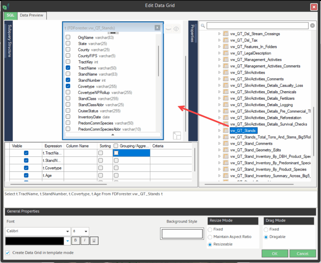 Step 6: Under “General Properties” near the bottom of the window, check the box next to “Create Data Grid in template mode.”