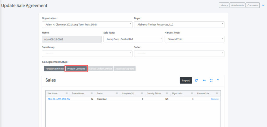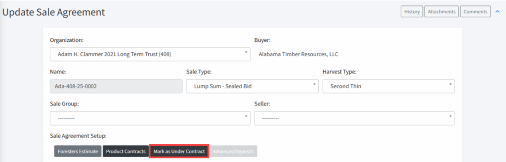 - Until the Sale Agreement is Marked as Under Contract, additional Timber Sales can be added. If additional Timber Sales are needed after the Timber Sale Agreement is executed, a new Timber Sale Agreement must be created.