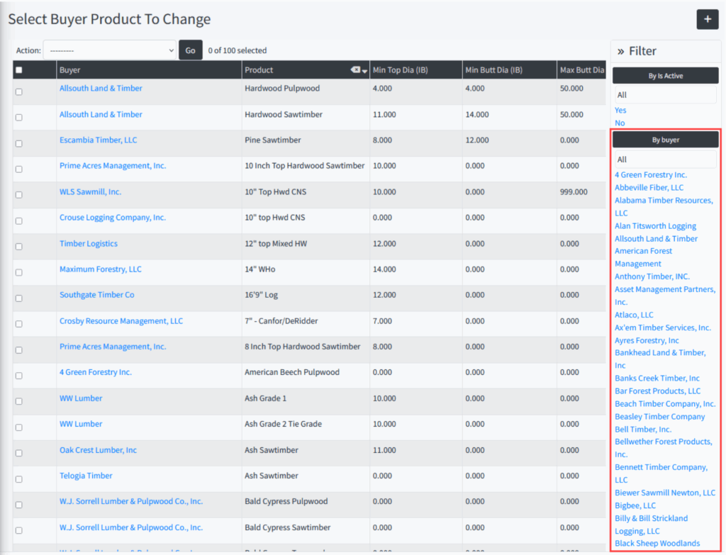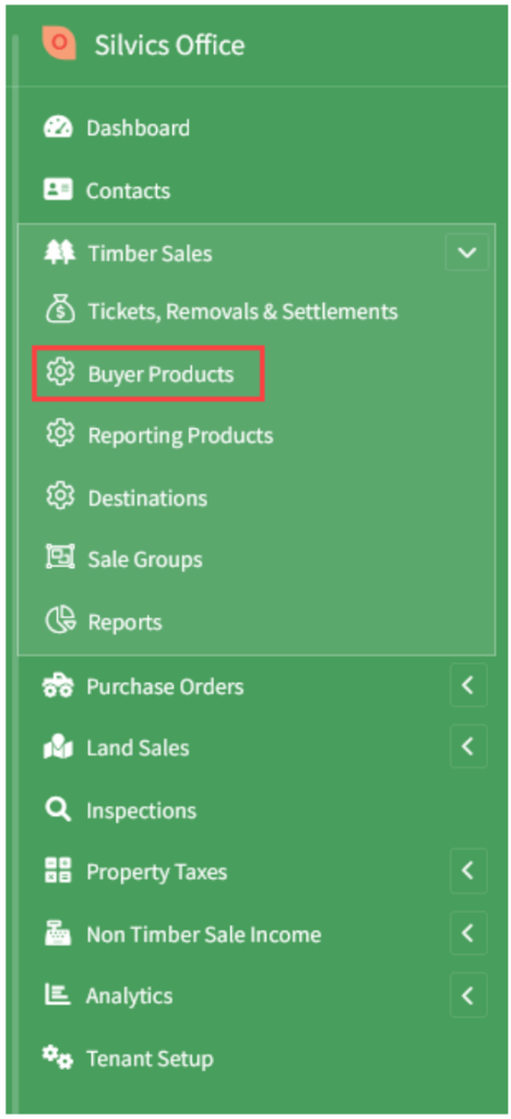 - If the Buyer Product is not available in the drop-down menu then it needs to be added to the Buyer Product table found underneath the “Timber Sales” section in the menu on the left side of the window.